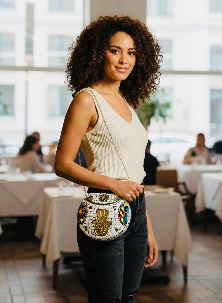 Krisha has traveled across the globe to adorn you with embellishments of metals, stones, beads, and shells of glorious colors depending on your bag of choice. She comes with a gold or silver chain (attached or detachable) depending on style of bag which makes it super multi-functional. You can wear her as a shoulder bag, crossbody, or a clutch.